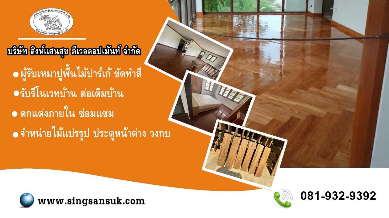 จำหน่ายไม้พื้นทุกชนิด รับเหมาปูขัดทาพื้นไม้ปาร์เก้ โดยทีมงานมืออาชีพมากกว่า 20ปี จำหน่ายเฟอร์นิเจอร์ไม้ ประตู หน้าต่าง วงกบ ไม้สัก ไม้มะค่า ประตูไม้ สั่งทำประตูไม้ ในราคาโรงงาน ประตูไม้สัก ไม้สน ไม้เนื้อแข็ง ไม้แดง ไม้เต็ง จำหน่ายเสาบันได ช่างปูกระเบื้อง